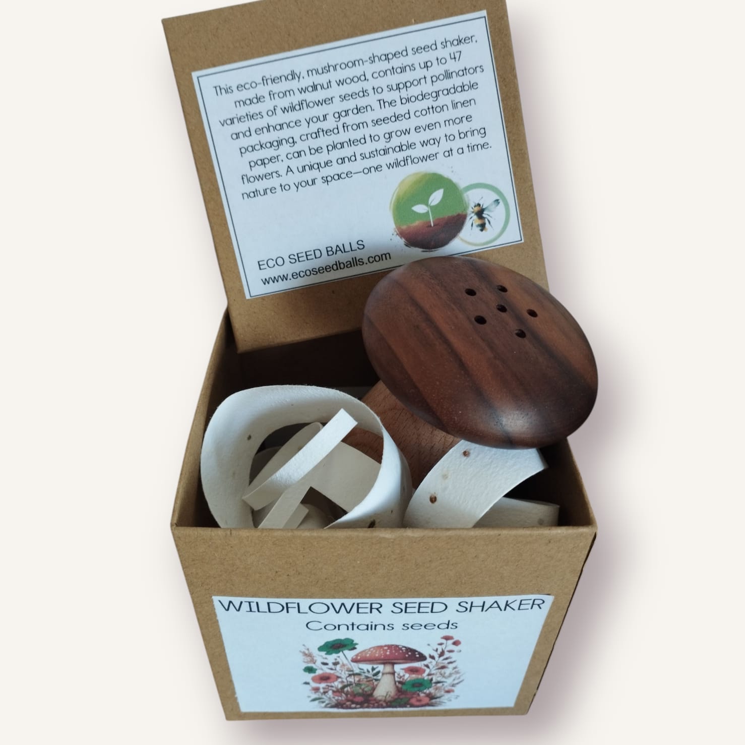 Each shaker is meticulously crafted from beech wood with the lid being premium walnut wood, giving it a charming, natural feel. Standing at 8.5cm tall and 7.5cm wide, its delightful mushroom shape adds a whimsical touch to any space. Inside the shaker's lid, you'll find a clever paper tab. Just pull it, and watch as up to 47 varieties of exquisite wildflower seeds gently shake out through six small holes, making seed distribution incredibly easy and controlled.